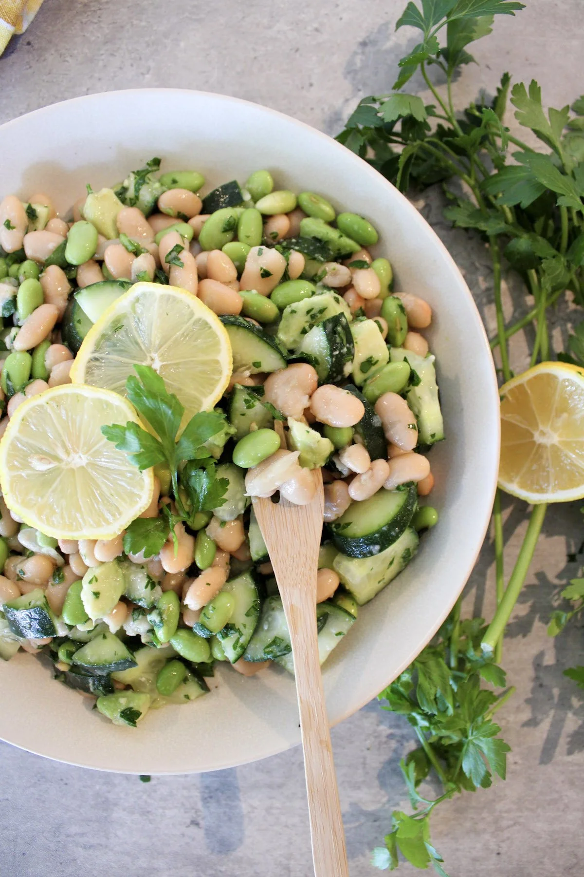 Full of flavor: Freshly chopped cabbage, cucumber, and fresh herbs are all coated in a delicious soy dressing for an asian inspired bean salad recipe that you’ll love.