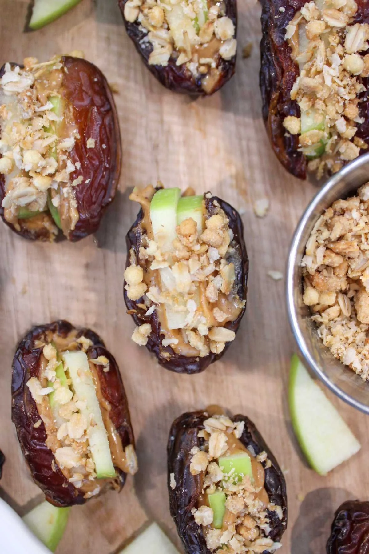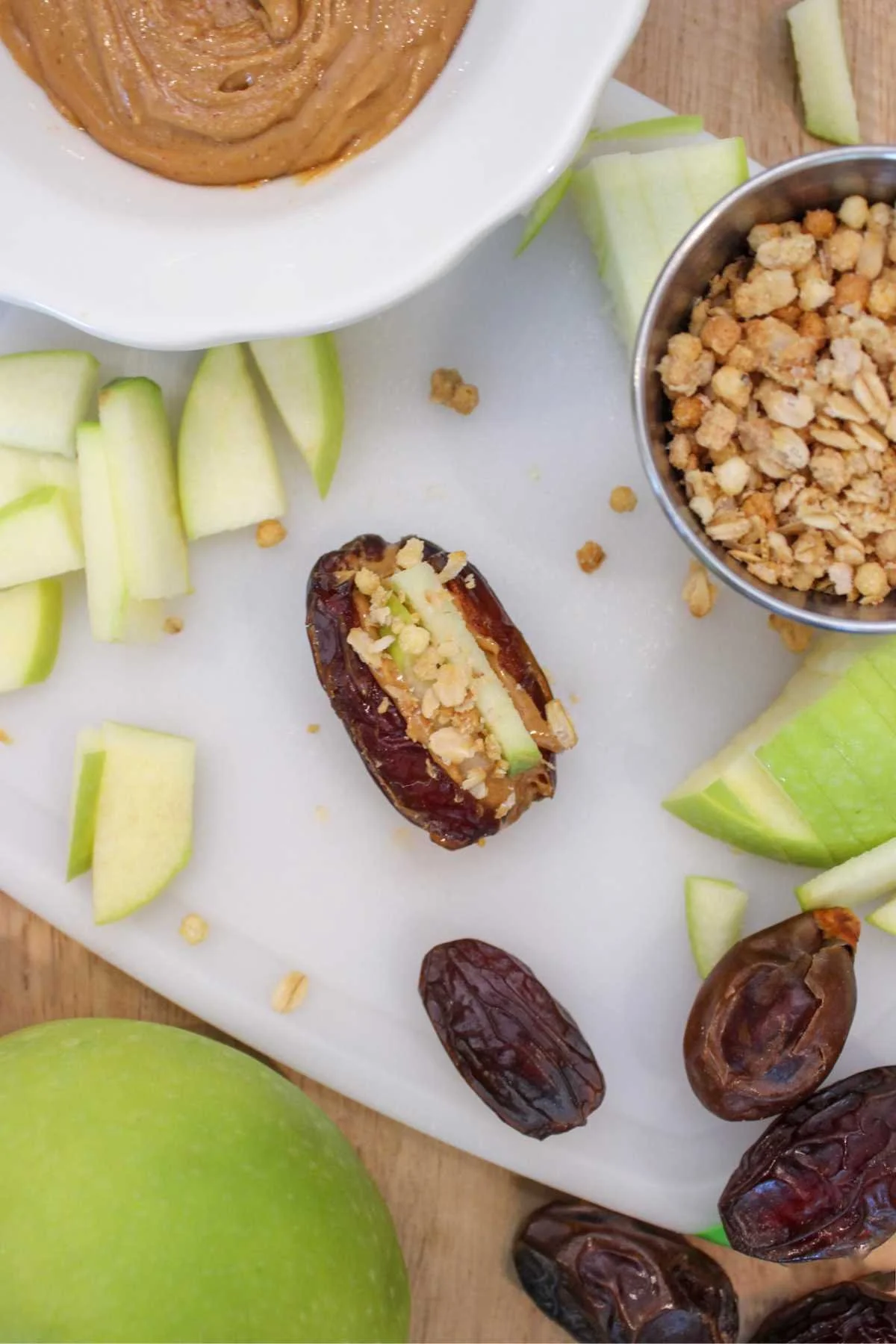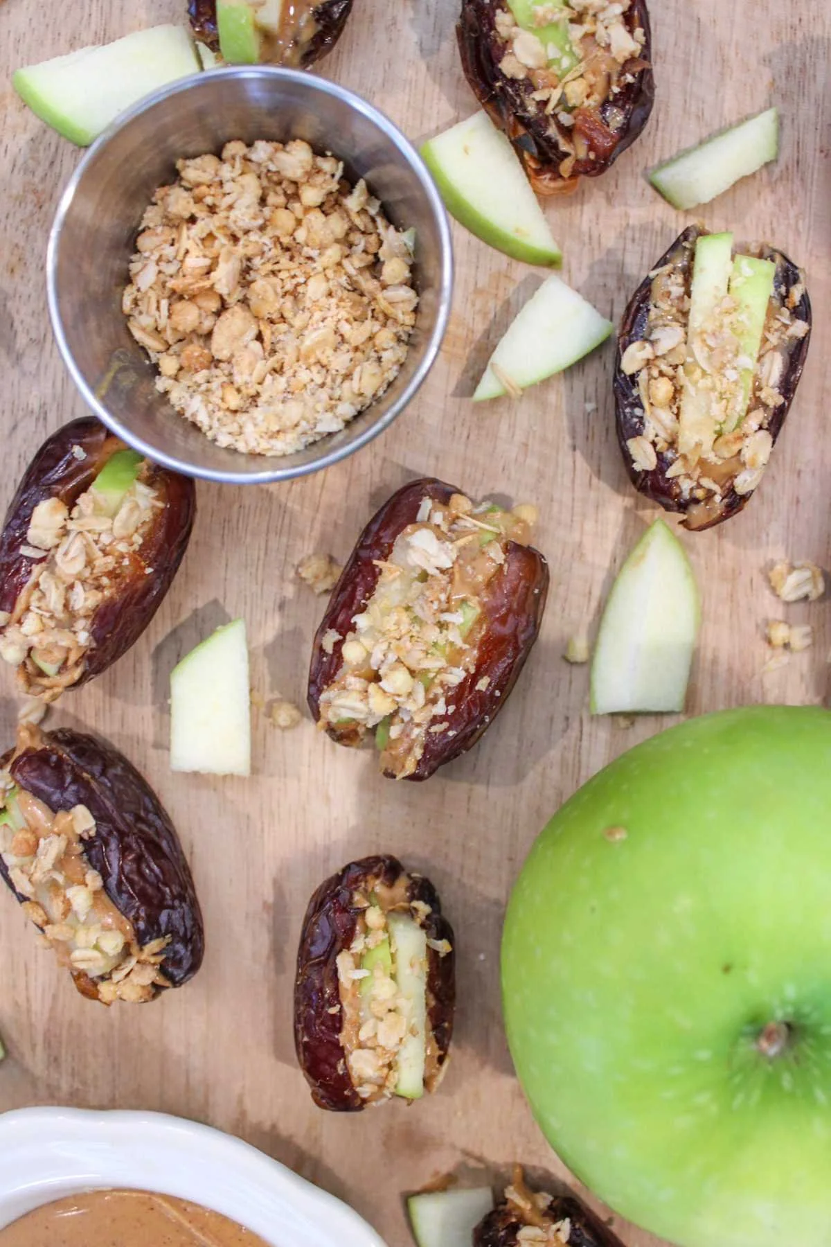 Only 4 ingredients: All you will need for this recipe are medjool dates, tart green apples, creamy peanut butter (or nut butter of your choice), and a crunchy topping like granola.