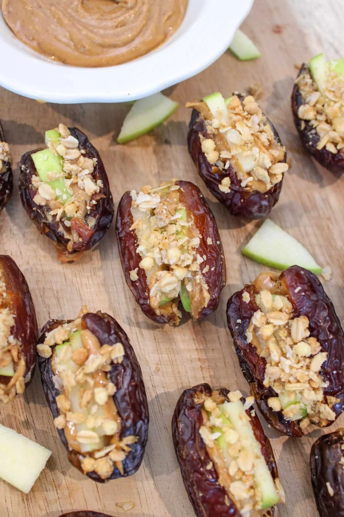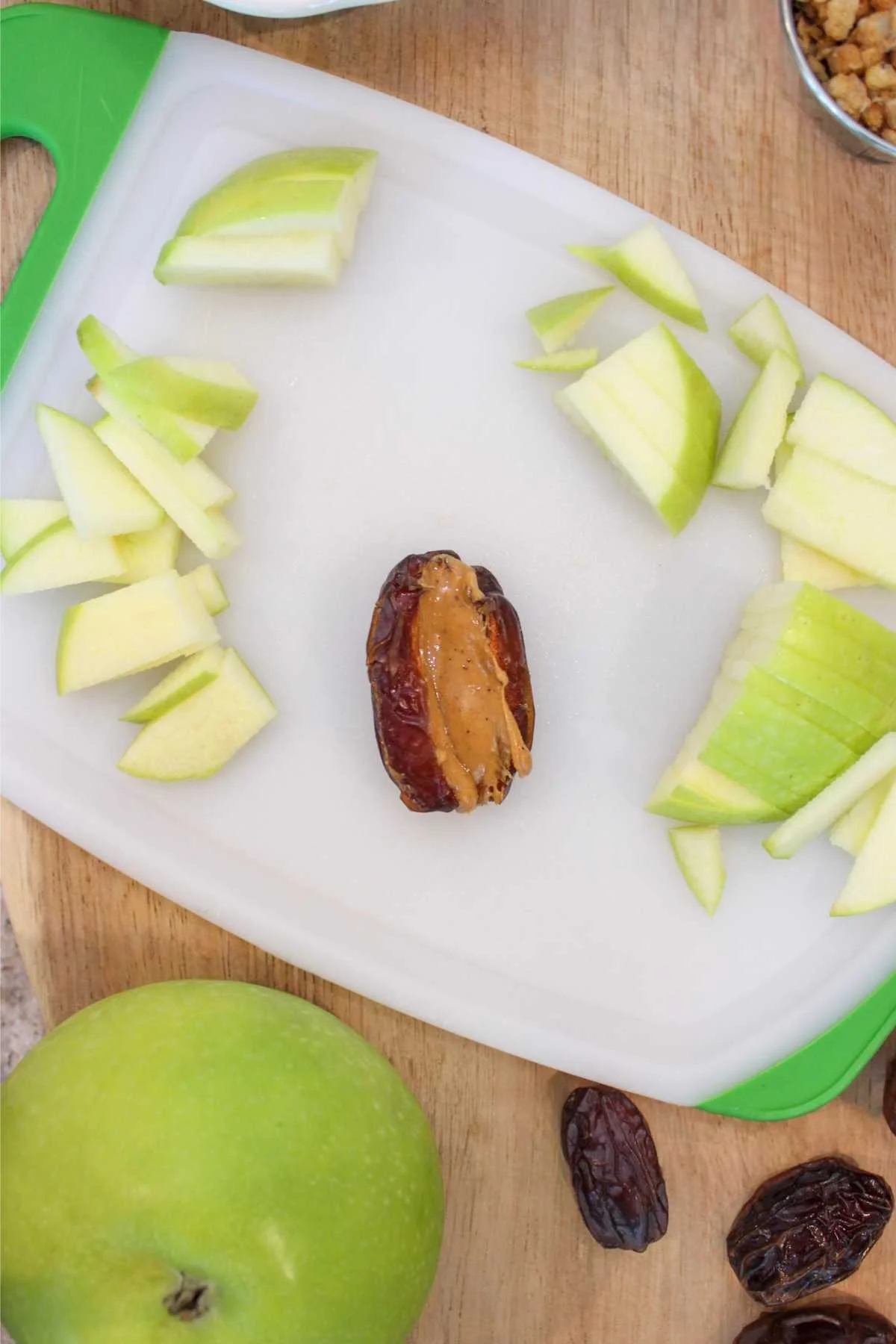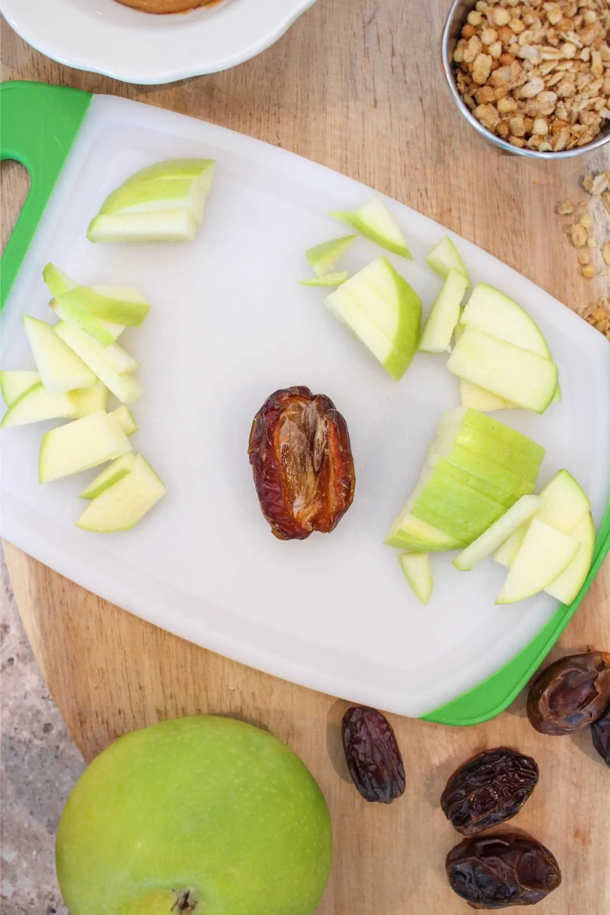 Only 4 ingredients: All you will need for this recipe are medjool dates, tart green apples, creamy peanut butter (or nut butter of your choice), and a crunchy topping like granola.