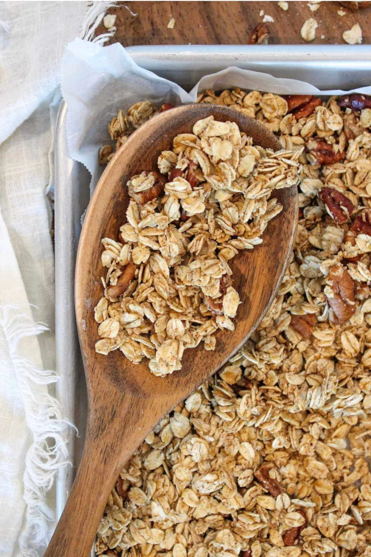 Maple syrup is a classic flavor in the fall and its natural sweetness is displayed perfectly in this lightly sweetened granola recipe. With less added sugar than other granola recipes and most of its flavor coming from fall spices, this easy maple pecan granola is full of the fall flavors that you love and is the perfect addition to yogurt bowls or oatmeal.