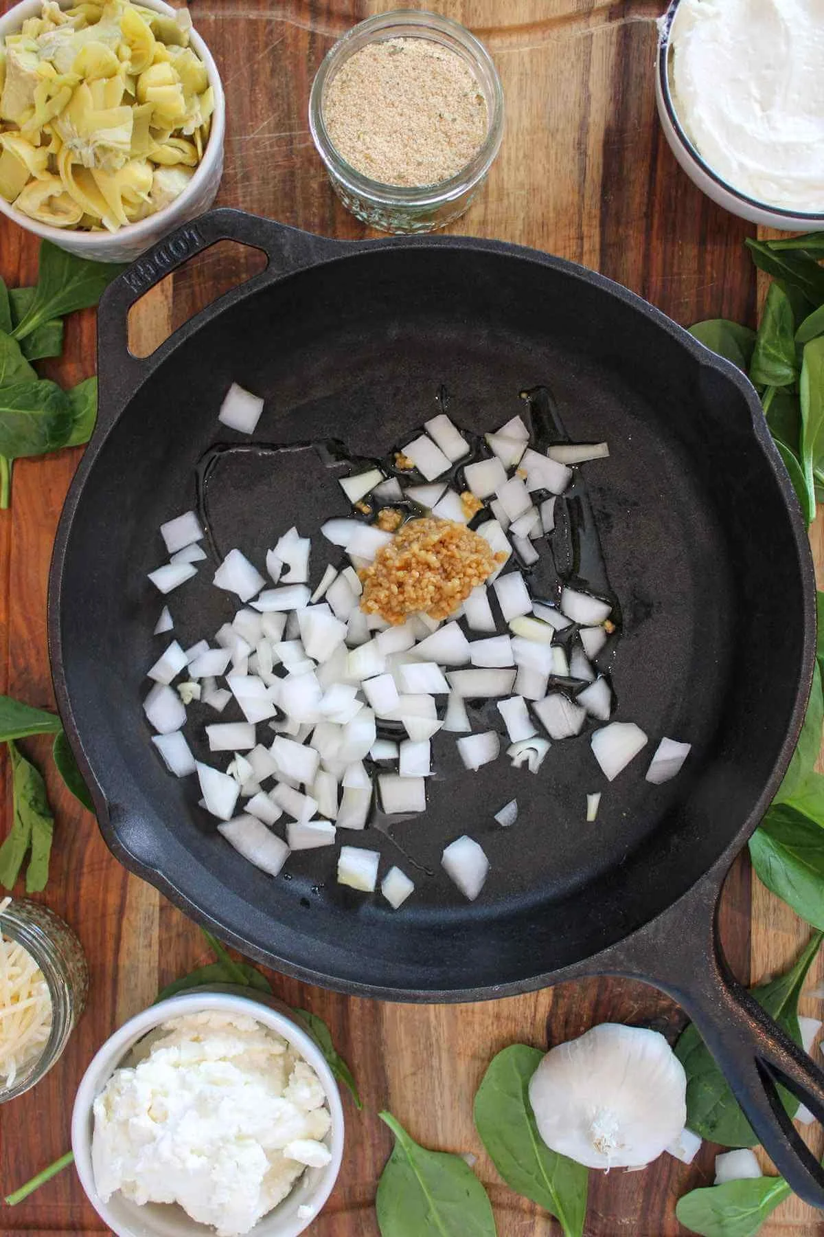Now let’s walk through how to make this healthier spinach and artichoke dip. The best part? It comes together in just a few steps and only makes a few pans dirty (especially if you use a cast iron skillet).