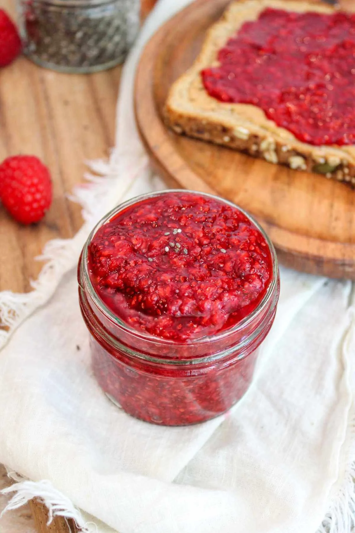 Note: Your raspberry chia seed jam will continue to thicken in the fridge as the chia seeds continue to absorb the raspberry juice. If needed, you can thin it out with a little bit of water!