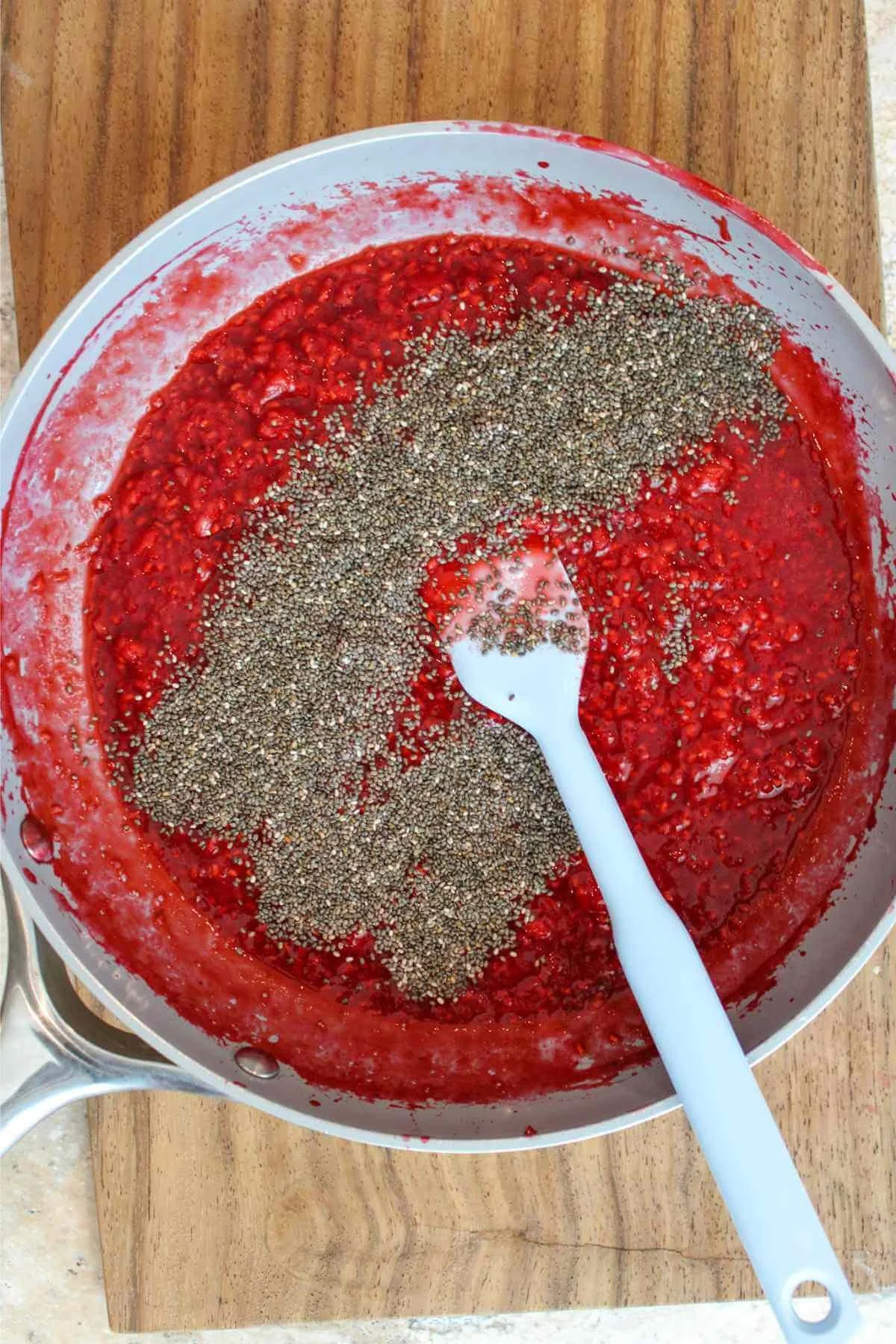Combine the raspberries and chia seeds after your raspberry juice is bubbling and then allow them to simmer together to soften the outer shell of the chia seed.