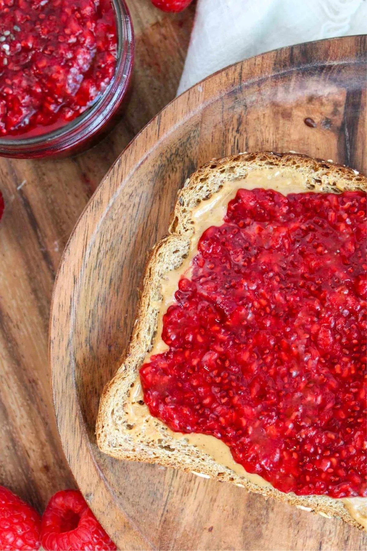One swap I made is to always serve his sandwich on a whole grain bread option that is full of fiber and has minimal added sugar. Next, I try to choose a peanut butter that has minimal ingredients. Finally, I added fruit and fiber to his sandwich with this easy raspberry jam recipe with chia seeds.