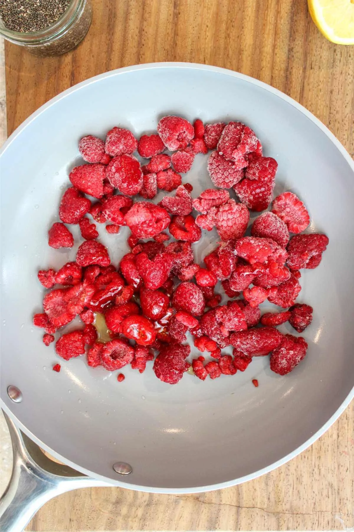 Start by heating your frozen raspberries in a saucepan over medium heat first to allow the fruit juices to release.